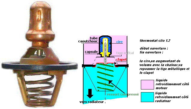 هي عبارة عن أداة دورها التحكم في حرارة المحرك، فهي تتحكم في كمية مرور الماء من الراديتور إلى المحرك، و عند إرتفاع درجة حرارة المحرك إلى حد معين تفتح هاته القطعة لمرور الماء، لذلك عند تعطل الحساس يبقي منغلق، أي أنه سيمنع مرور الماء و بالتالي إرتفاع درجة حرارة المحرك.